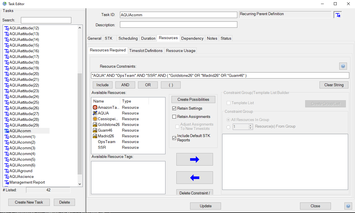 The defined resources listview contains a list of all of the defined resources, resource template list, or resource tags that may be included as the task's resource constraints. All resources that are associated with an STK object will have an icon to the left of the resource name showing the type of STK object it represents. Single-clicking on an object will select it so that it may be used with the Include or the Add To Group buttons. Double-clicking on the object will cause it to be placed in the Resource Constraints textbox at the cursor location. Selecting multiple resources and then clicking ADD will include all the selected resource ANDed together in the Resource Constraints Formula textbox at the current cursor position. Selecting a resource tag will open the Resource Tag Constraint Editor (the format for manually defining resource tags can be found here).
