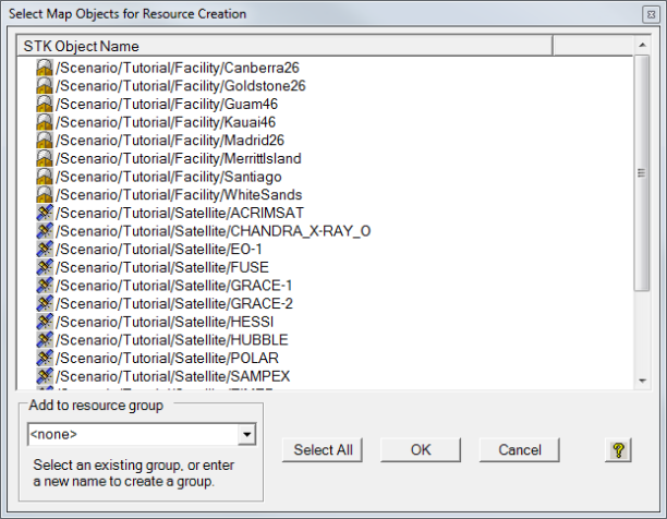 The Select STK Objects for Resource Creation form allows you to select one or more STK objects to be used to create one or more STK Scheduler resources. All resources created using this feature will assume the default resource attributes.