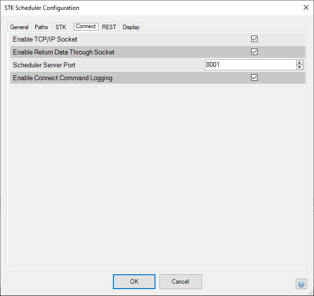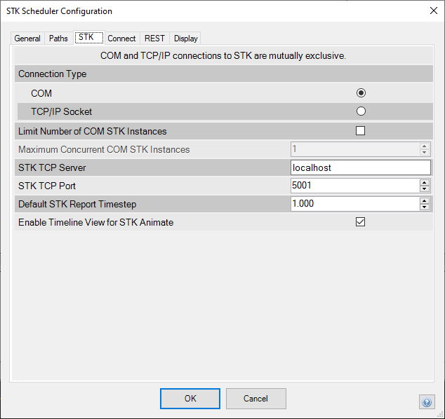 The TCP/IP Socket option enables connection from Scheduler to STK via TCP/IP socket. This should be used with STK engine applications.