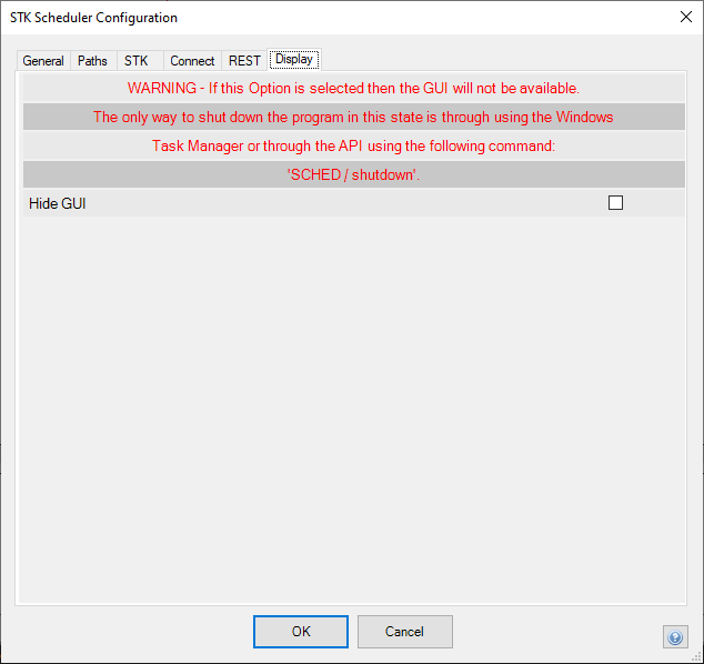 The Hide GUI Checkbox disables the STK Scheduler GUI. The only way to re-enable the GUI is via the API using the 'SCHED \ ShowGUI'. Then the only way to shutdown Scheduler in this state is via the API using the command 'SCHED \ Shutdown'.