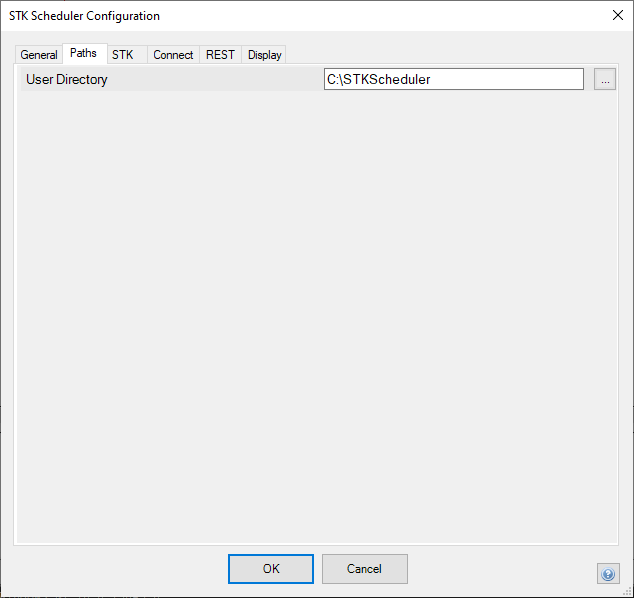 The User Directory textbox defines the location into which temporary STK Scheduler working files will be stored, as well as the event logs.