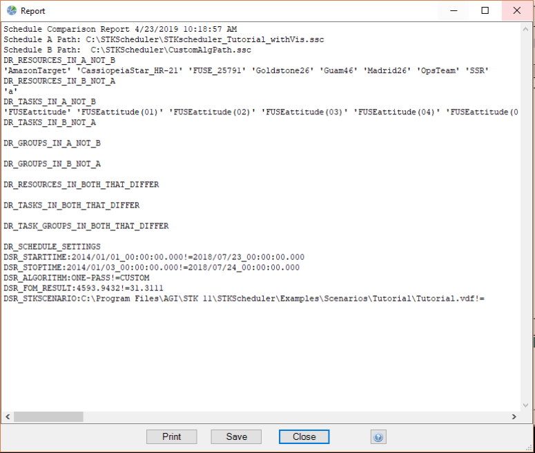 The report is in several sections, described below. For the purposes of the report, "Schedule A" is the currently-selected schedule, and "Schedule B" is the second schedule, either chosen via the file browser or named by the <SchedulePath> argument.