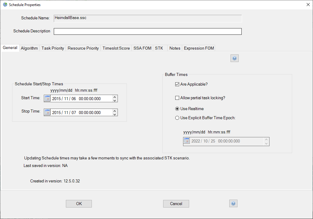 Each schedule file contains a set of parameters that govern the schedule and are contained in the Schedule Properties Form. This form can be open by selecting Schedule -> Properties... from the STK Scheduler Menu Bar.