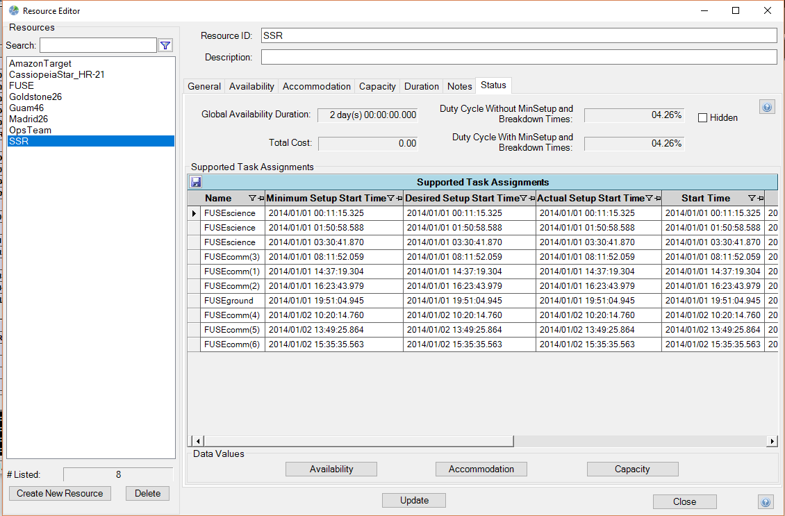 The tasks support listbox displays all of the tasks that use the resource. For each task, the table also includes times that the resource is used by a task and the amount of capacity the resource has following the task. The information displayed in the textbox is provided for user information only and is therefore not editable. The listbox will display accurate information only after the schedule deconflictor is run.