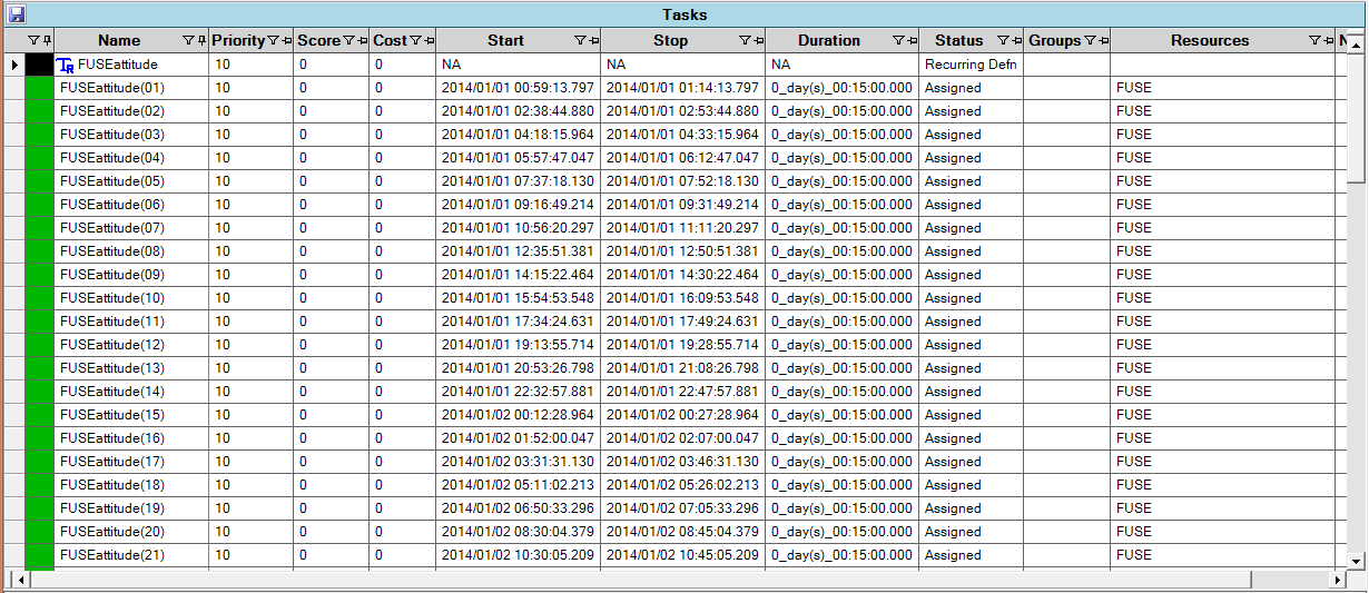 Because the table view does not require a large number of graphical objects to be created and update, it may offer considerable performance advantages over the Graphical View when working with schedules with large numbers of tasks, resources or timeslots. Various icons appear to the left of the task names. The description of the various colors and icons used in the table may be found on the Legend.