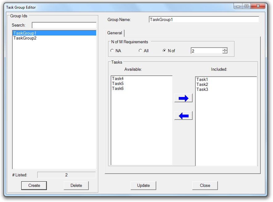 The Add button moves a selected task from the available tasks listbox into the not included tasks listbox thereby associating a task with the group. A task may be associated with multiple task groups.