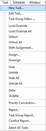 Locks a selected task so that its assignment will not change if the scenario is deconflicted. If no task is selected, a form will open that will allow you to choose one or more unlocked tasks to lock. All unlocked tasks will be scheduled around any locked tasks.