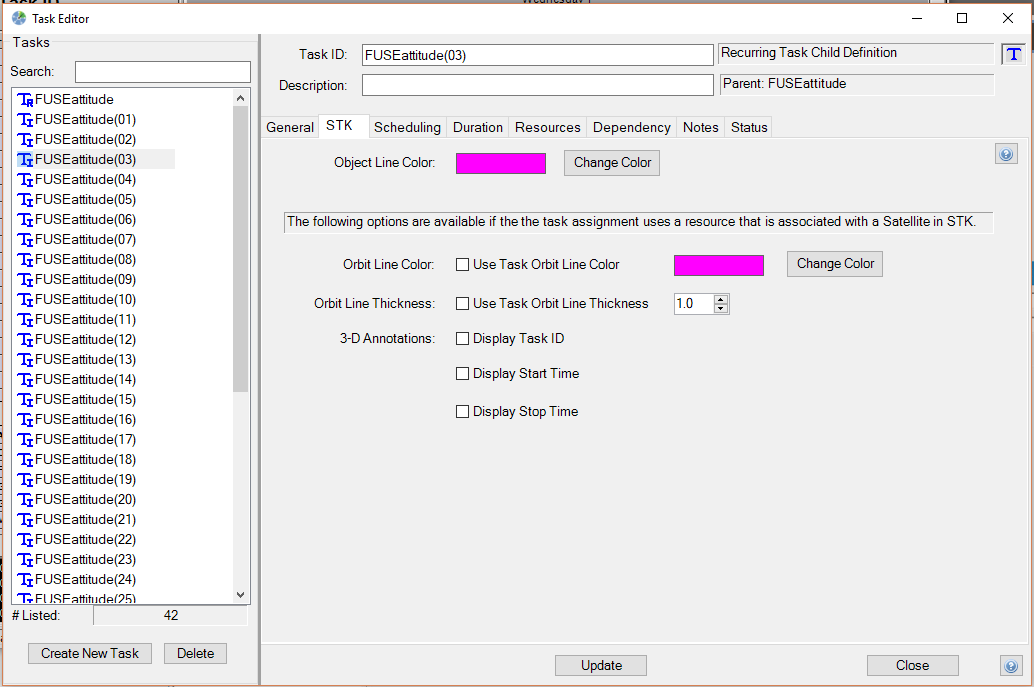 The Display Task ID checkbox allows you to toggle if the task IF is displayed on the satellite orbit during the task assignment. The assignment must use a resource that is related to a STK satellite.