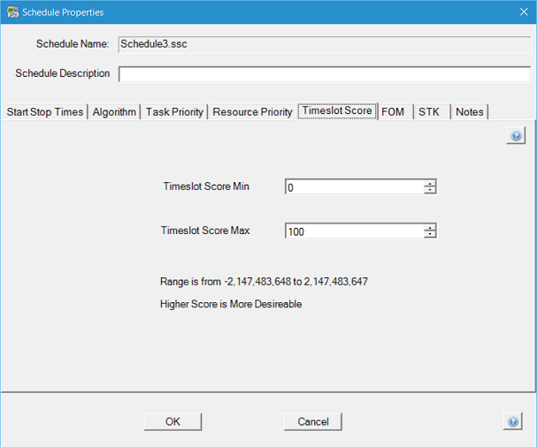 STK Scheduler allows you to specify a score value to each slot using the Timeslot Definition Form. The Figure of Merit calculation uses the slot scores to determine which of the possible deconflicted schedule solutions contains a resource possibility/slot pair that is most preferred. STK Scheduler allows you to determine the score range within valid integer min/max values (-2, 147, 483, 648 to 2, 147, 483, 647).