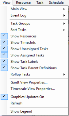 The show resource option allows you to select whether or not resource availability histograms will be shown at the bottom of the Gantt chart.