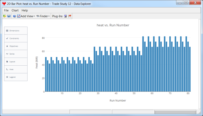 The 2D Bar Plot displays an X-Y plot of variables in the model. The Data Explorer stores values for all variables in a model and special variables from the trade study, such as the objective function for the Optimization Tool. Any variable in the Model can be plotted against any other variable.