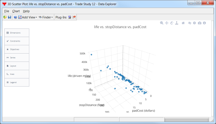 The 3D Scatter Plot displays an X-Y plot of variables in the model. The Data Explorer stores values for all variables in a model and special variables from the trade study, such as the objective function for the Optimization Tool. Any variable in the model can be plotted against any other variable.