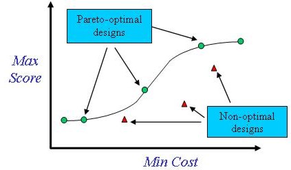In general, the solution to multi-objective optimization problems is a family of designs that is often referred to as the Pareto-optimal set. A Pareto set is defined as feasible designs that are not inferior in all objectives to any other designs. Each design in the Pareto-optimal set have the property that no other design can be found that is better in all objectives. A design is referred to as non-optimal (dominated) when another design can be found that has better values for all objectives.