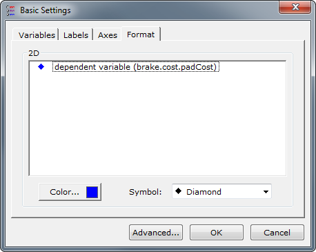 This tab allows you to change how a particular series in the graph is displayed. After selecting a particular series, you may press the Color... option to choose a color for the line, or you can select a different symbol to use for the markers from the Symbol dropdown. Note that symbol markers cannot be selected unless supported by the graph type