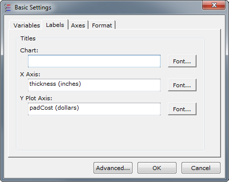 By default, the x-axis and y-axis are labeled with the variable name, and if available, units. From this tab you may change Chart, X-Axis, or Y-Axis label text by their corresponding edit boxes. You may also change the font used for each of these labels by clicking on the Font button next to each of the item's edit box.