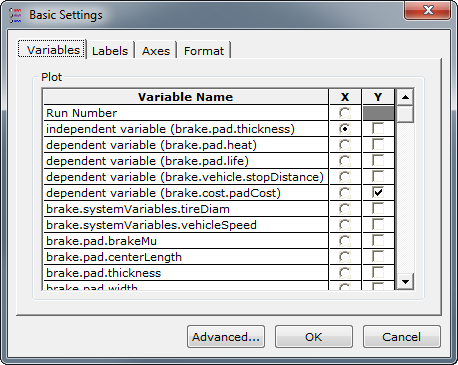 By default, a graph will display series in accordance with the design parameters set by the trade study tool. From this tab, however, you can change your x-axis variable by selecting a different variable in the X column. You can also add or remove series by clicking a variable's check box in the Y column.