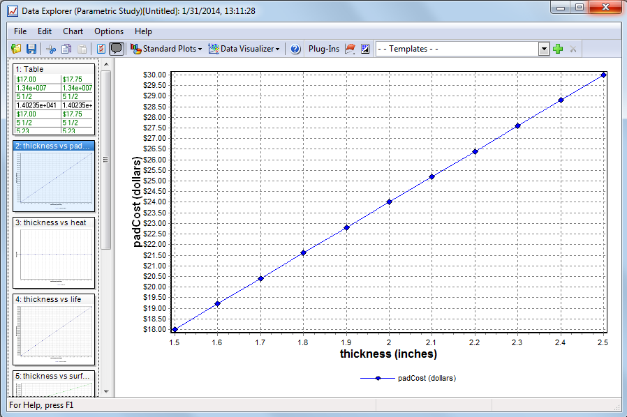 The 2D Graph pages display an X-Y plot of variables in the Model. The Data Explorer stores values for all variables in a Model and special variables from the trade study, such as the objective function for the Optimization Tool. Any variable in the Model can be plotted against any other variable. You can change the variables used to generate the plot by selecting Basic Settings... from the Chart menu, then selecting which variables you want to be your x and y variables. The default 2D graph from most tools is a Line graph, but there are several other varieties of 2D plots (Area, Bar, Horizontal Bar, Pie, Point, and Polar), which you can add by clicking the Standard Plots button in the Data Explorer, selecting the appropriate graph type in the resultant list, then pressing the OK button.