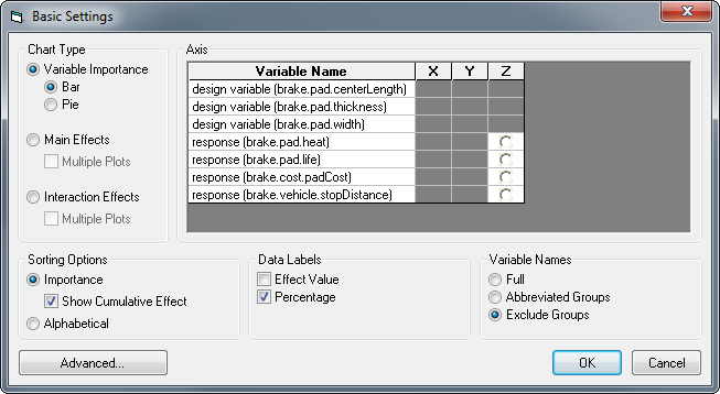 - Axis - Select the output variable (Z-axis), the X-axis variable (Main and Interaction Effects plots) and Y-axis variable (Interaction Effects plots)