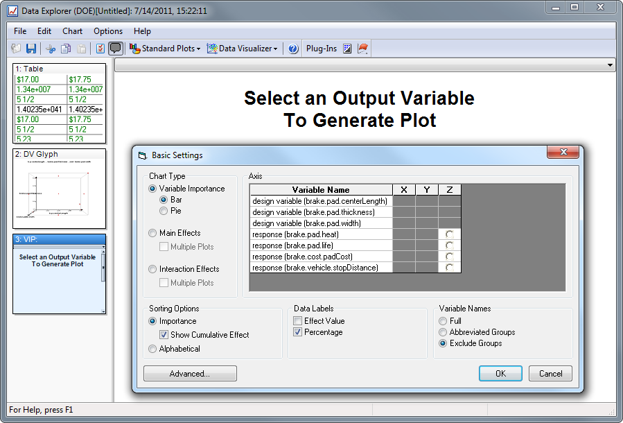 When an output variable is selected, the data will be analyzed to determine how each design parameter (and combinations of design parameters) affect that variable. The length of this analysis will depend on the number of design parameters, the amount of data that needs to be analyzed, and the nature of the design space. For large problems, this analysis can take several minutes (or more). The analysis can be canceled at any time by pressing the Cancel button.