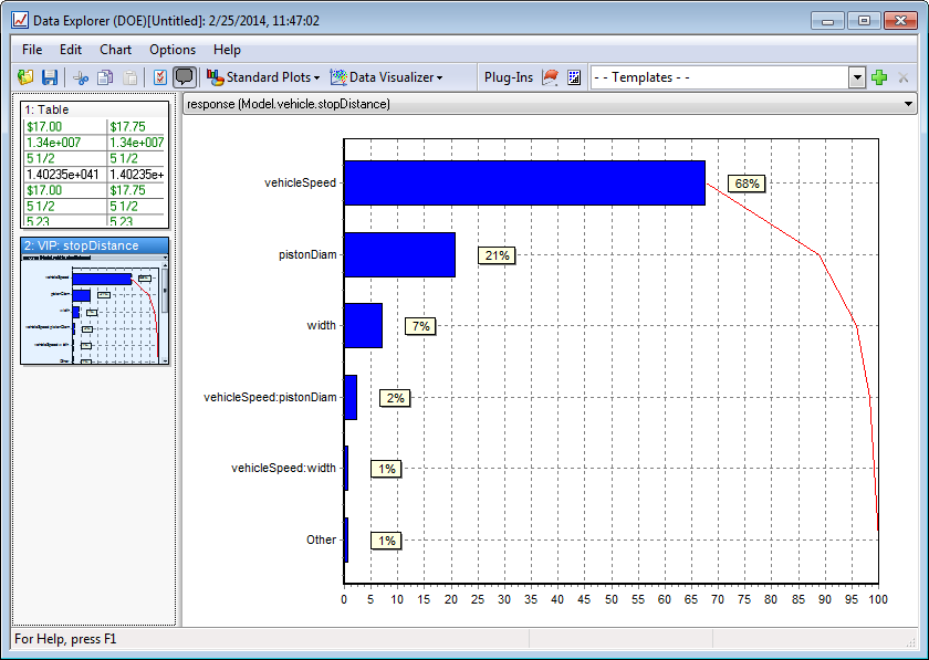 Note that there is a small interaction between the vehicleSpeed and pistonDiam parameters (2%). To the extent that this interaction is important, this means that the effect of varying the vehicleSpeed parameter will depend on the value of the of the pistonDiam parameter, and visa-versa. Note that if a variable is part of a significant interaction effect, it should not be neglected in your design studies even if it appears to have little effect on its own.