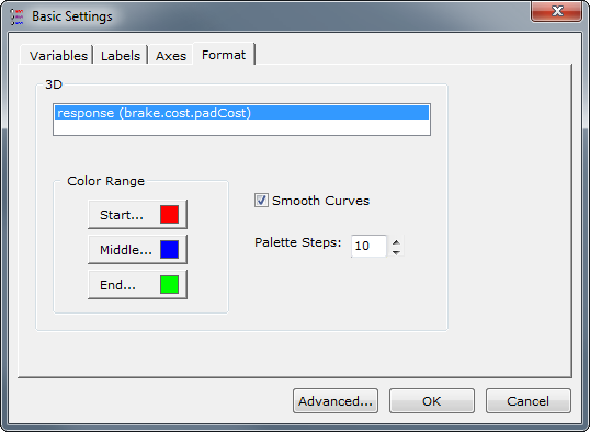 This tab allows you to change how a particular series in the graph is displayed. After selecting a particular series, you may alter the colors used in that series with Start..., Middle..., or End... buttons to choose the color for the corresponding part of the surface. There are also options for:
