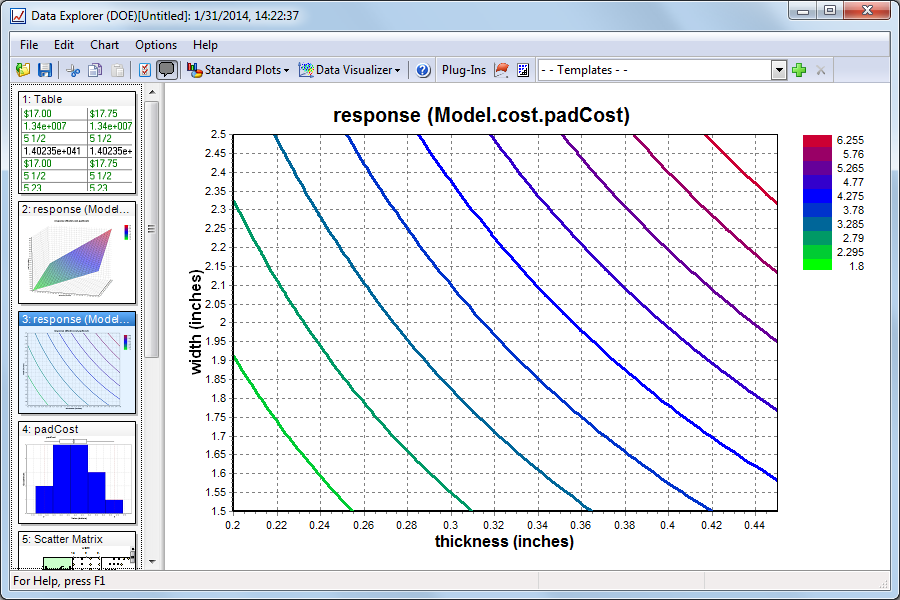 The Contour Plot measures the effects of 2 independent variables on a given variable, but does so in a 2D fashion, using color to represent the range of values the dependent variable is in, like a topographical map.