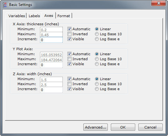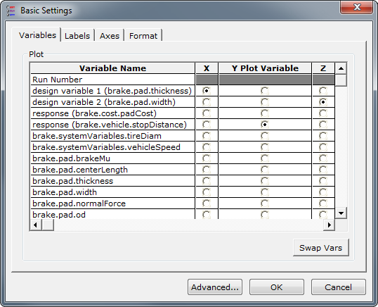 By default, a graph will display series in accordance with the design parameters set by the trade study tool. From this tab, however, you can change your x, y, and z-axis variables by selecting different variables in the X, Y, and Z columns, respectively.