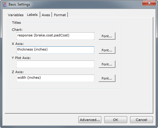 From this tab you may change Chart, X-Axis, Y-Axis, or Z-Axis label text by their corresponding edit boxes. You may also change the font used for each of these labels by clicking on the Font button next to each of the item's edit box.