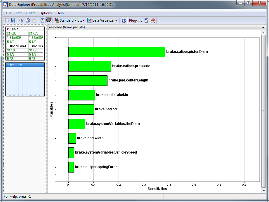 The R Squared Plot allows visualizing how much the design variables influence a particular response. Values range between 0 and 1, with values farther away from 0 indicating a stronger correlation.