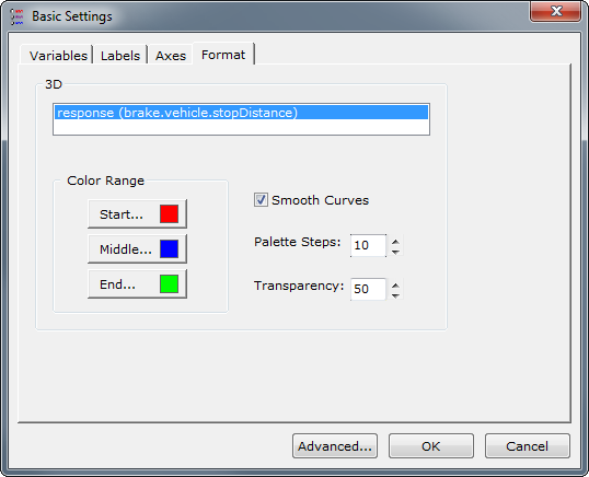 This tab allows you to change how a particular series in the graph is displayed. After selecting a particular series, you may alter the colors used in that series with Start, Middle, or End buttons to choose the color for the corresponding part of the surface. There are also options for: