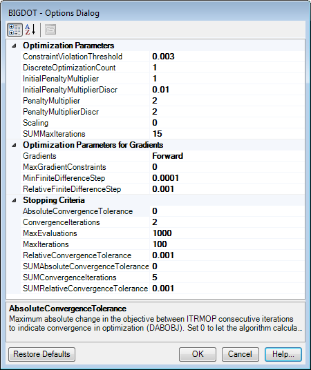 | AbsoluteConvergenceTolerance (DABOBJ) | 0 | Maximum absolute change in the objective between ITRMOP consecutive iterations to indicate convergence in optimization. Set 0 to let the algorithm calculate this parameter. Thus value should be greater than or equal to 0. |