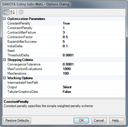 InitialDelta: Solis-Wets algorithm uses a set of offsets from the current iterate to locate improved points in the design space. Initial Delta provides the value for the initial step length. This option should have a positive real value.