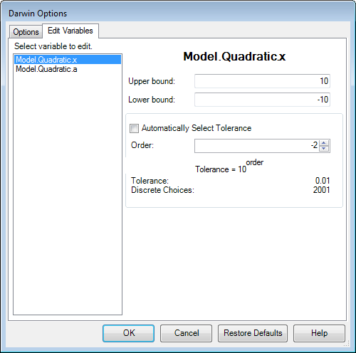 The automatically selected tolerance can be modified by the user at any time. To do this, open the Darwin options dialog by pressing the Options button in the Optimization Tool when Darwin is the selected algorithm. Select the Edit Variables tab, and select the name of the variable whose tolerance you would like to modify. Uncheck the "Automatically Select Tolerance" checkbox, and then change the tolerance by entering a value in the "Order" text field . The tolerance will be set to a value equal to 10order.