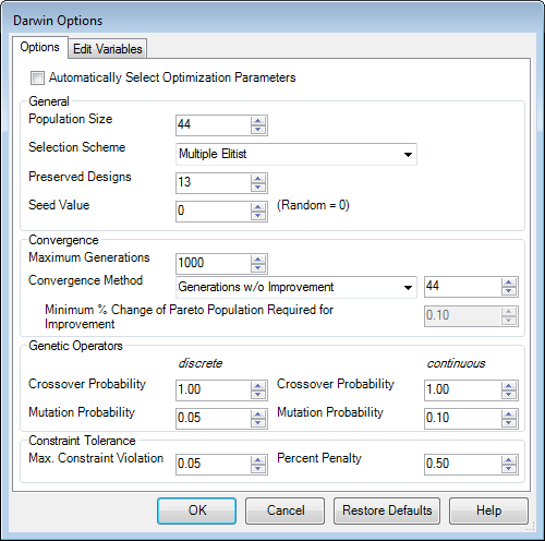 Darwin is a genetic search algorithm developed specifically for solving engineering optimization problems. Darwin is capable of handling discrete variables, continuous variables, and any number of constraints. Because Darwin does not require gradient information, it is able to effectively search non-linear and noisy design spaces.