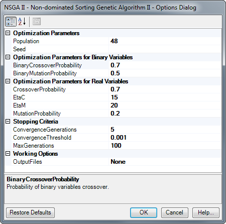 | BinaryCrossoverProbability | 0.7 | Crossover probability for binary variables. Option must have a value between 0 and 1. |