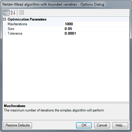 | Tolerance | 0.0001 | The algorithm will terminate when the size of the simplex falls below this threshold value. Option must have a value greater than 0. |