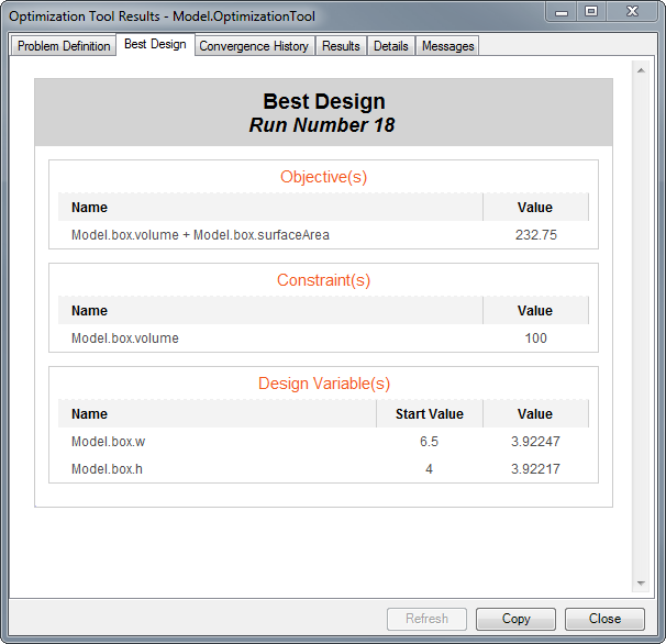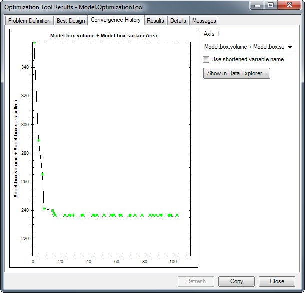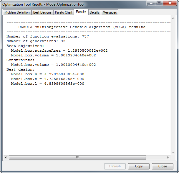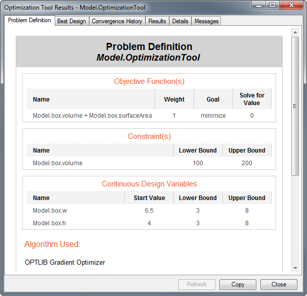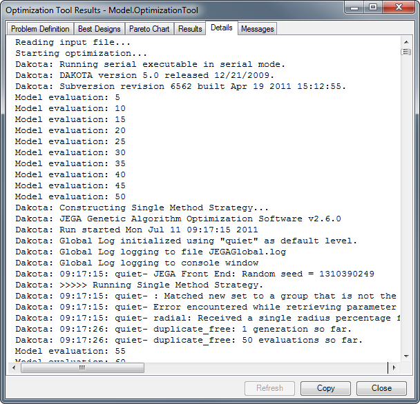 To view the Optimization Tool output, click on the View Output button. The Optimization Tool Output can be viewed at any time, and can be updated during the optimization run using the Refresh button. The Optimization Tool Output Dialog has six tabs, each displaying different information about the optimization run. Each page can be copied as an image and, if applicable, as text using the Copy button.