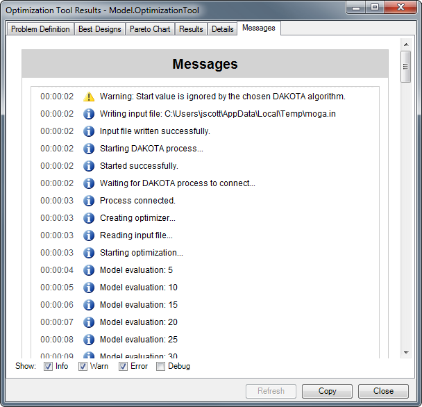 The Messages tab displays all of the messages that the algorithm sent back to the infrastructure. These are the same messages that get displayed in the Status area on the Optimization Tool form. These messages can be filtered by message type: