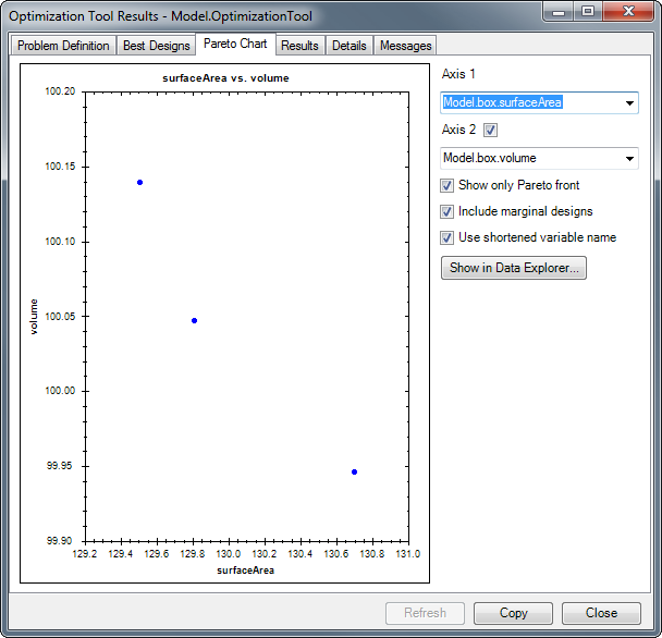 If the problem formulation is multi-objective, then Best Designs Tab is displayed, showing the Pareto front of best designs. The different best designs in the Pareto front can be selected using the Select Design drop-down box. All of the designs in the Pareto front can be show in a table form by clicking the Show in Data Explorer button.