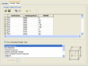 Using Design of Experiments, you can gather information about your model's behavior by running it for a number of different input variable combinations. The DOE tool is a convenient way to begin exploring your design space, and is often the starting point for performing more sophisticated model analyses using, for example, the Variable Importance Profiler or Prediction Profiler. You can perform n-dimensional parametric studies by specifying the number of samples for each of the input variables or you can choose from a variety of pre-defined "experimental designs". These experimental designs include a wide range of standard experiments, as follows: