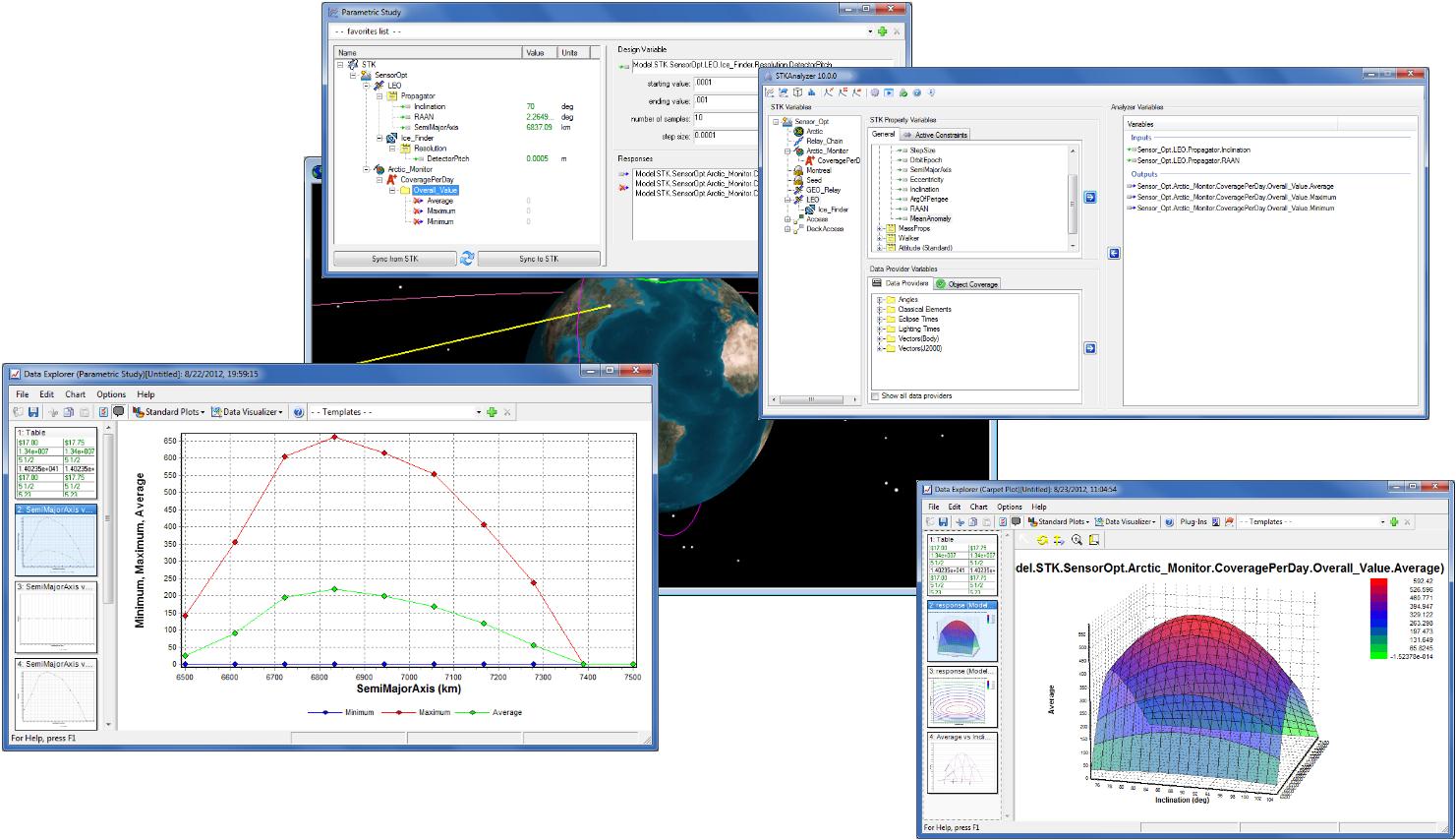 After creating a Scenario in STK, there is often a need to verify its accuracy and visualize/understand overall trends. Using the Parametric Study Tool, Carpet Plot Tool, and DOE Tool, you can systematically vary one or more of your input variables, run your scenario, and tabulate and visualize the results using line, surface, contour, and carpet plots. With these tools, you can gain a basic understanding of scenario trends and verify that the predictions of your scenario agree with your expectations.