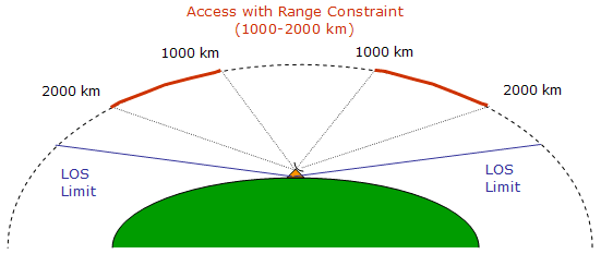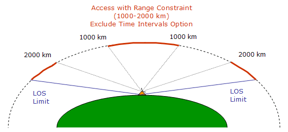 If you impose minimum and maximum range constraints of 1000 km and 2000 km, respectively, intervals of line of sight access during which the range from the facility to the satellite is less than 1000 km or greater than 2000 km are excluded from the time period: