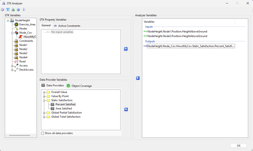 You can add any of the STK variables as ModelCenter input or output variables through the STK Analyzer window that appears. If you change the value of a variable in your scenario through the STK interface or the ModelCenter Component Tree, you should re-add the variable into ModelCenter or re-run the workflow before running any trade studies with the new value.