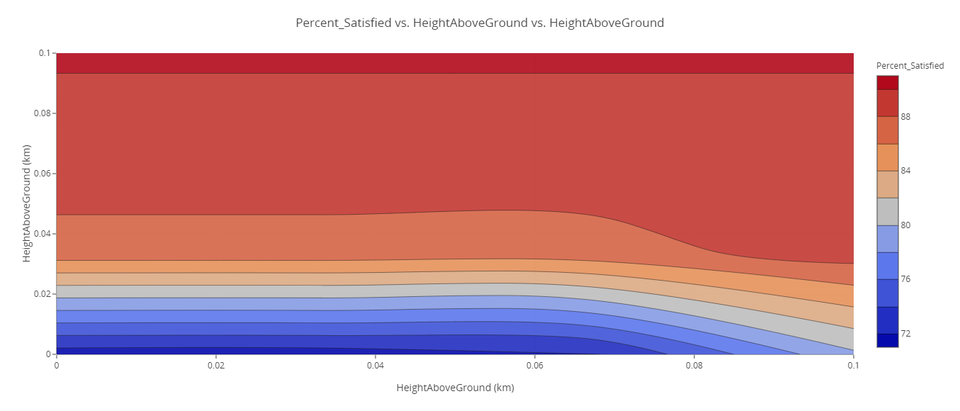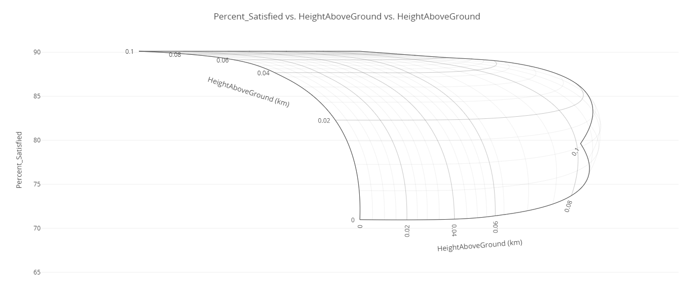 Using a prebuilt scenario, you computed access between a constellation of four communication nodes along a route through mountainous terrain and determined the overall satisfaction using a Figure of Merit object. Using the STK Plugin for ModelCenter, you imported the node height and satisfaction data providers from your scenario into the ModelCenter model-based systems engineering software. You then created a Carpet Plot and a Contour Plot using two of the Node height variables, which showed that changing one Node's height had a greater impact on the coverage satisfaction than the other. Finally, you performed a Design of Experiment test on all four Node heights and generated a Variable Importance Summary Plot, which showed that Node2's height had the greatest impact on the overall coverage compared to the other node locations.
