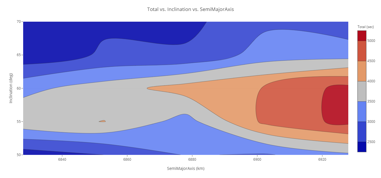 Now that you have performed Parametric Studies on each parameter, you have an idea for the general ranges where the duration is the greatest for each orbital parameter variable (semi-major axis and inclination). These two parameters can be plotted together efficiently to find the best combination that maximizes.