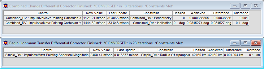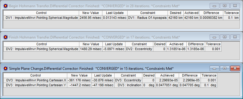 Each maneuver and their results have a target status window showing the independent variables and results. The Delta-V required for each maneuver in seen in the New Value column.