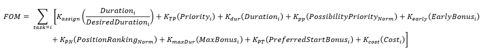 - Kdur is the weight given to tasks with longer duration. The value may be defined on the FOM Properties Tab of the Schedule Properties Form.