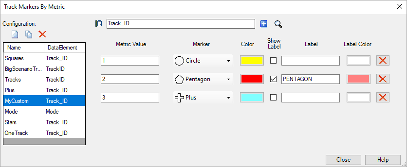 Marker configurations are saved to your configuration folder and persist between scenarios. The Markers by Metric dropdown list populates with all valid saved Marker Configurations for the current track and auto-selects the configuration that matches the current track's Marker settings if any match exists.