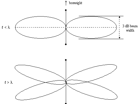 As illustrated in the following figure, if the antenna length is less than the wavelength of the signal, a single sidelobe is generated in each direction.