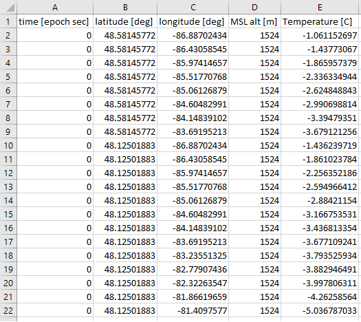 The CSV contains time data recorded as seconds from reference epoch in the first column, then three spatial coordinates in the next three columns (degrees latitude and longitude and the altitude above mean sea level, or MSL alt), and finally time-dependent volumetric temperature values in the fifth column.
